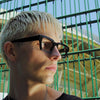 Rettangolare bold dai profili spessi, definiti da geometrie disegnate, per dare carattere al modello. Presentato in nero, mattone opalino e cristallo satinato.